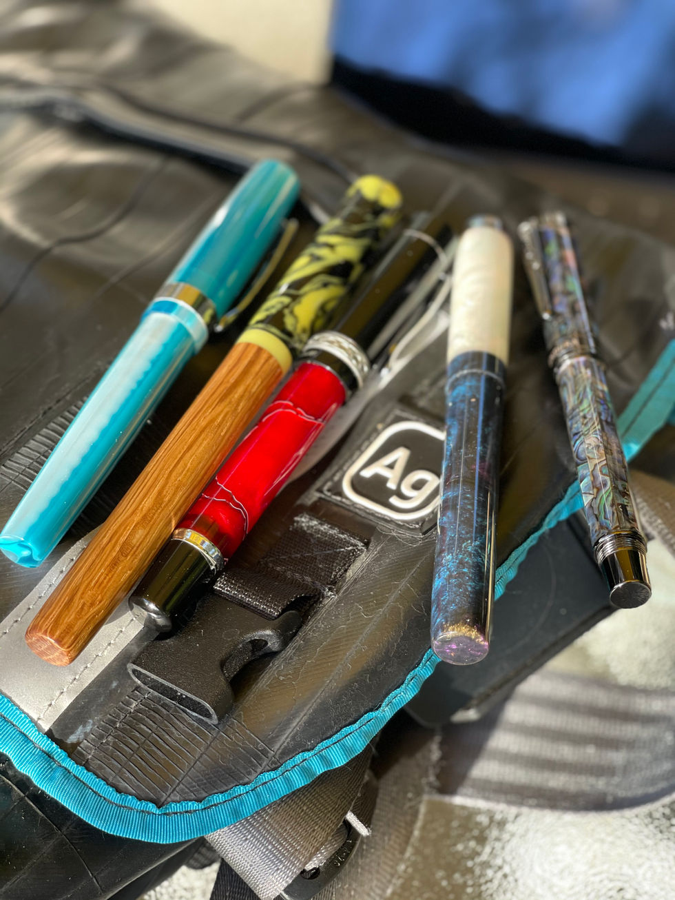 This project highlights a collection of handcrafted pens, featuring unique designs and craftsmanship. The images include handcrafted pens with a leather case, assorted handcrafted pens on a textured surface, and decorative pens on an American flag background.